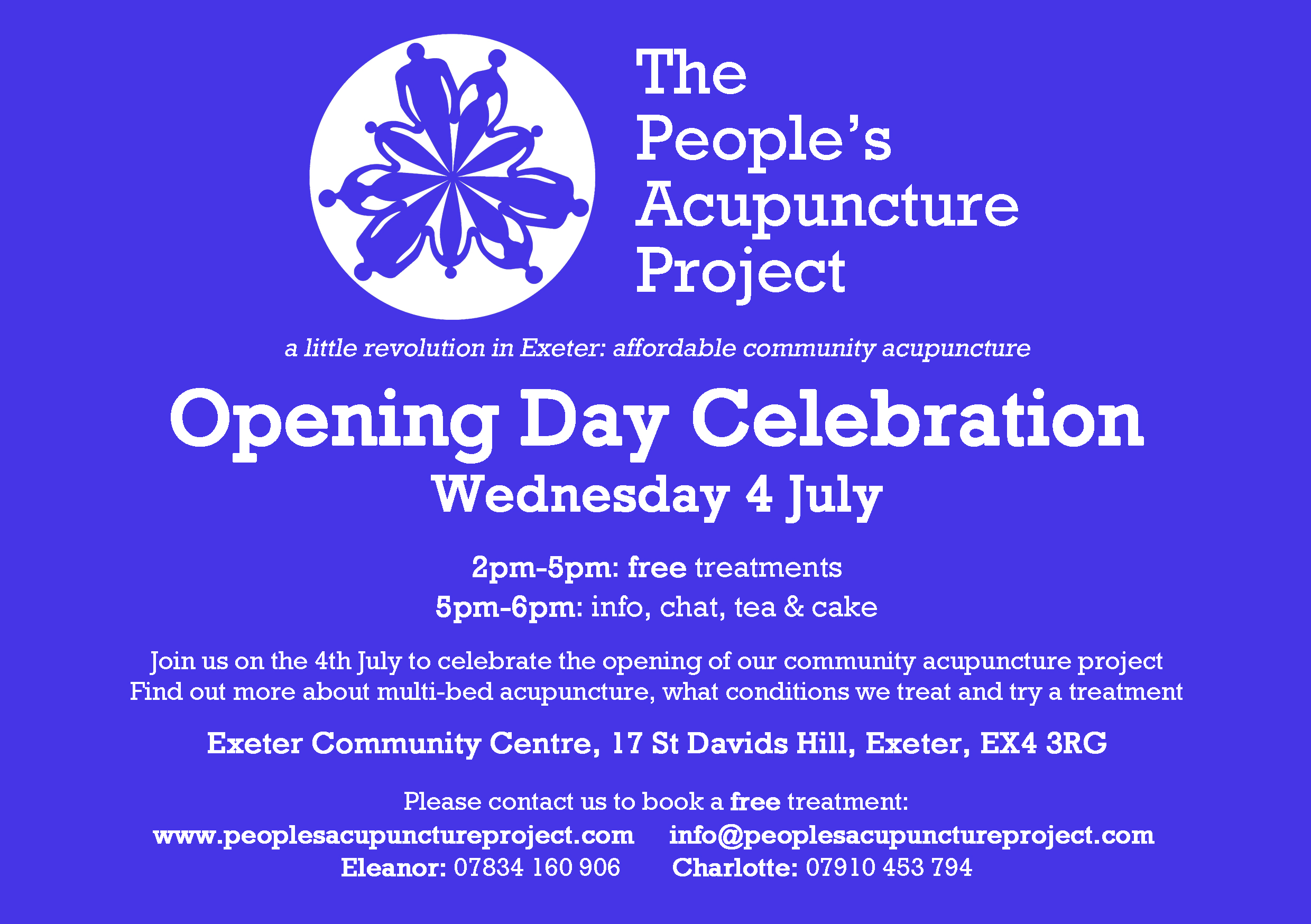 4TH JULY OPENING DAY CELEBRATION Posted bypeoplesacupunctureprojectJune 11, 2012June 21, 2012Posted inUncategorizedTags:Acupuncture, affordable, Community, Exeter, free, multibed Share this: Share on X (Opens in new window) X Share on Facebook (Opens in new window) Facebook Like Loading... Related