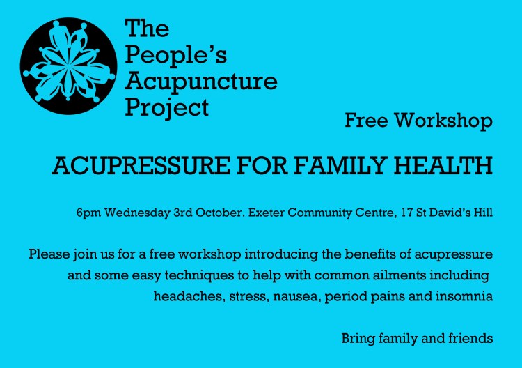 Free Workshop – Acupressure for Family Health Posted bypeoplesacupunctureprojectSeptember 12, 2012Posted inUncategorizedTags:acupressure, family, free, headache, health, insomnia, nausea, stress, workshop Share this: Share on X (Opens in new window) X Share on Facebook (Opens in new window) Facebook Like Loading... Related